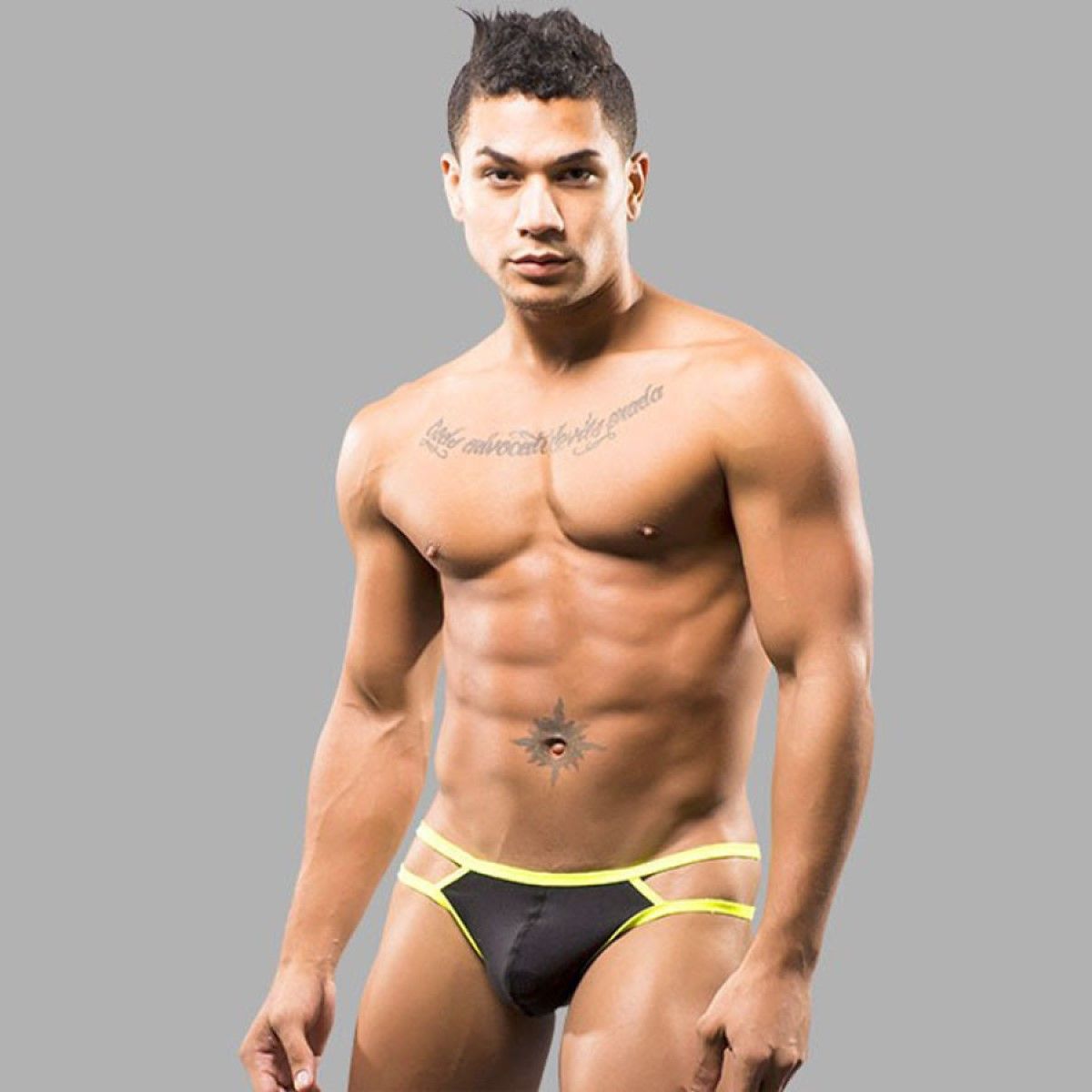 Черные мужские трусы-стринги с 2 боковыми бретелями.