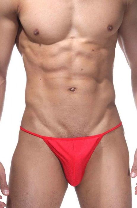 Гладкие тянущиеся минимальные стринги для мужчин ярко-красного цвета, на очень тонких резинках, V-формы сзади.