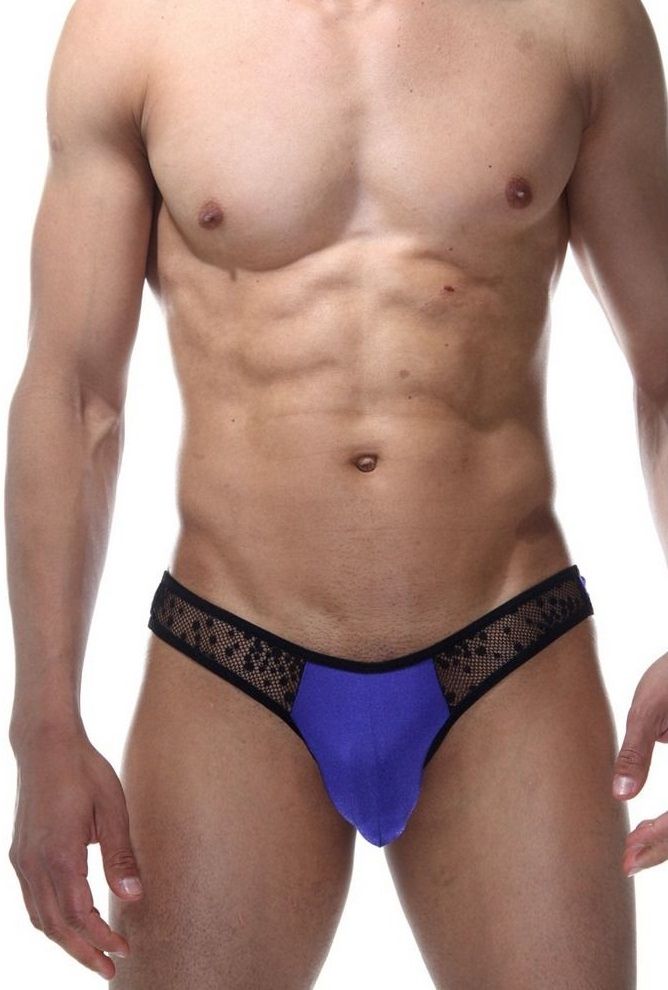 Бразилиана для мужчин, из тонкой полупрозрачной черной ткани-сетки и мягкого тянущегося материала ярко-василькового цвета.