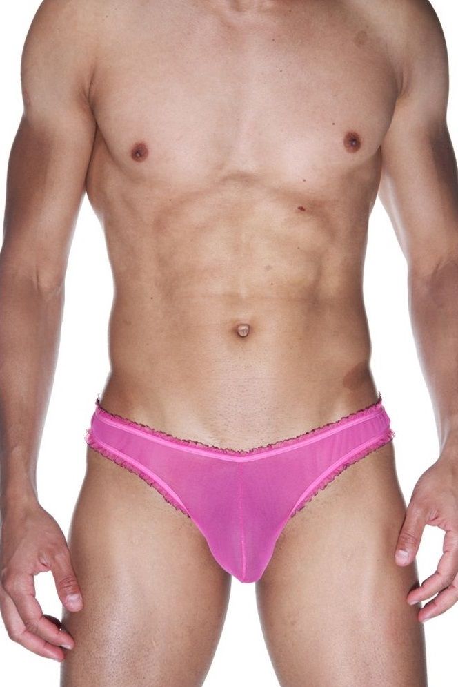 Мужские ярко-розовые трусы-бразилиана с рюшевой отделкой.