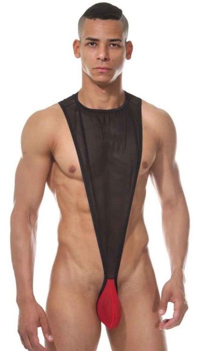 Оригинальное боди для мужчин, в котором скомбинирована верхняя полупрозрачная с контрастным гульфиком.