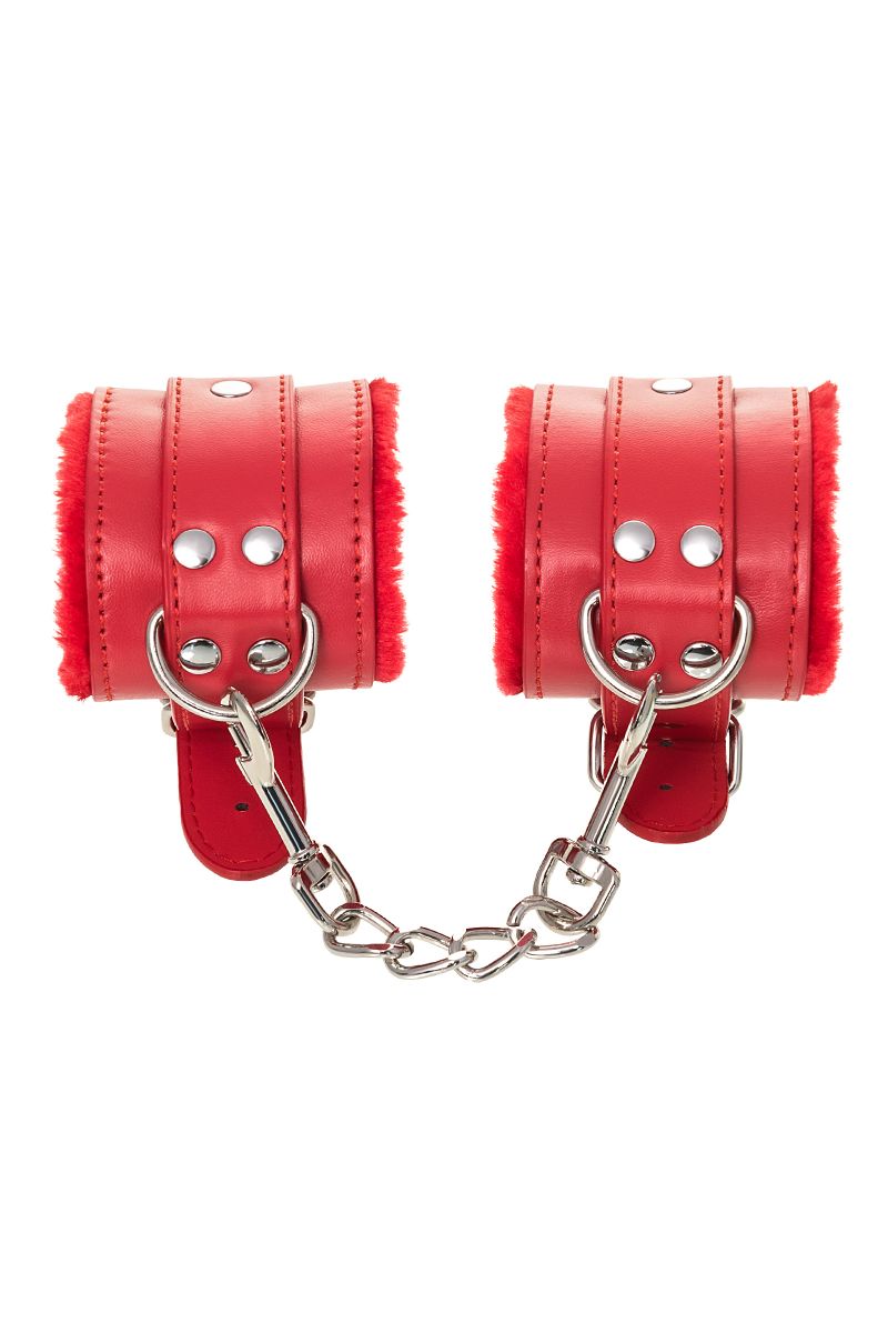 Наручники яркого красного цвета с металлической отделкой говорят вовсе не об агрессии. Эти произведения искусства говорят о страсти, которую можно проявить, но только с разрешения Доминанта. Подклад из искусственного меха делает ношение этих наручников более комфортным, но расслабиться в них не получится – цепочка на карабинах сильно ограничивает свободу действий. Длина наручников позволяет использовать их практически на любой размер рук. Отрегулировать размер и силу обхвата легко с помощью ремешка и металлической пряжки. Наручники – классический предмет для игры в подчинение, обязательный для начинающих и опытных поклонников БДСМ. Дополните комплект аксессуарами – ошейником, кляпом, оковами и продемонстрируйте что значит грубое обращение и полный контроль над свободой. Ширина - 5,5 см. Длина сцепки - 15,5 см.