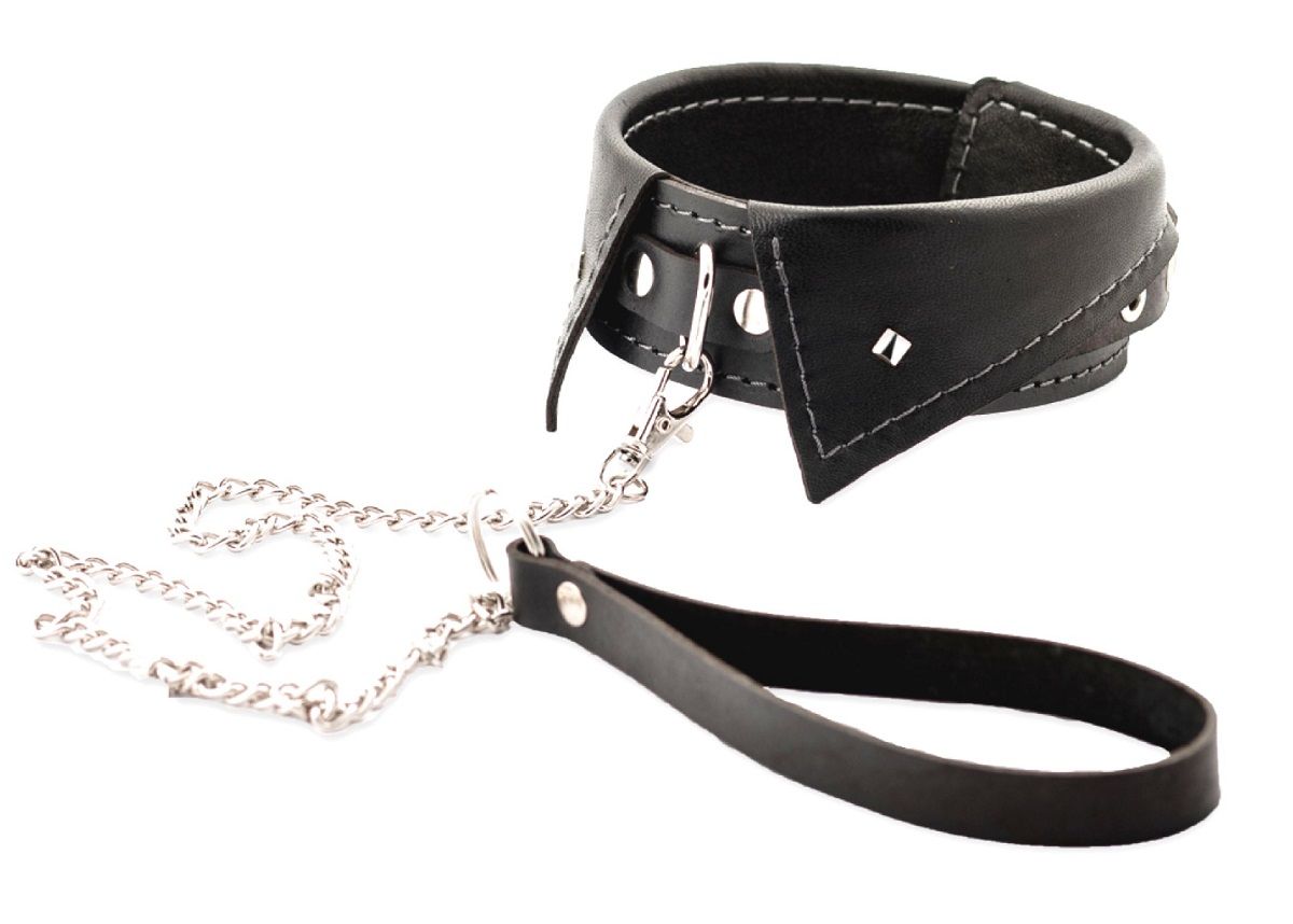 Ошейник-воротник имеет декоративную вставку с кольцом для крепления металлического поводка с удобной ручкой. Выполнен из натуральной кожи. Ширина ошейника - 4 см. Длина ошейника - 38 см. Длина поводка - 80 см.