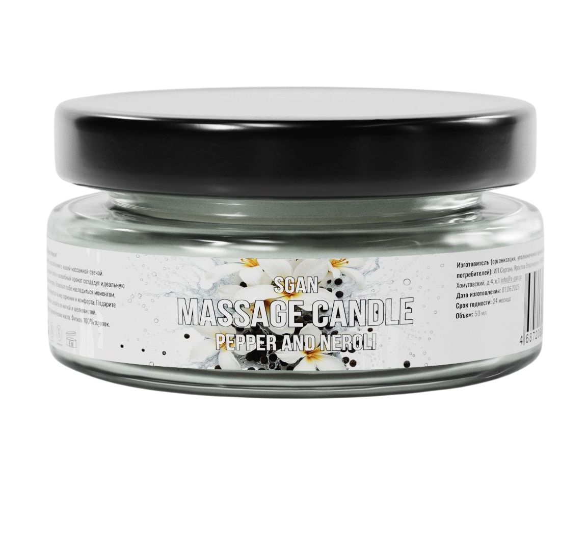 Массажная свеча с ароматом переца и нероли SGAN в стеклянной банке — это натуральное средство для расслабления, ухода за кожей и создания романтической атмосферы. Свеча изготовлена из 100% кокосового воска с добавлением ароматического масла перца и нероли и хлопкового фитиля, что обеспечивает безопасное и чистое горение. При нагревании свеча превращается в тёплое массажное масло, которое глубоко увлажняет, питает и смягчает кожу, делая её шелковистой и ухоженной. Приятный аромат перца и нероли наполняет комнату уютом и гармонией.